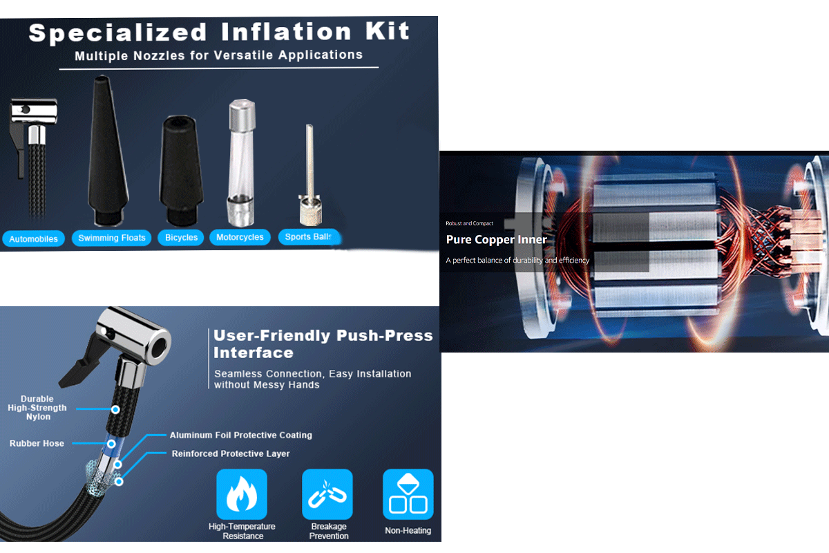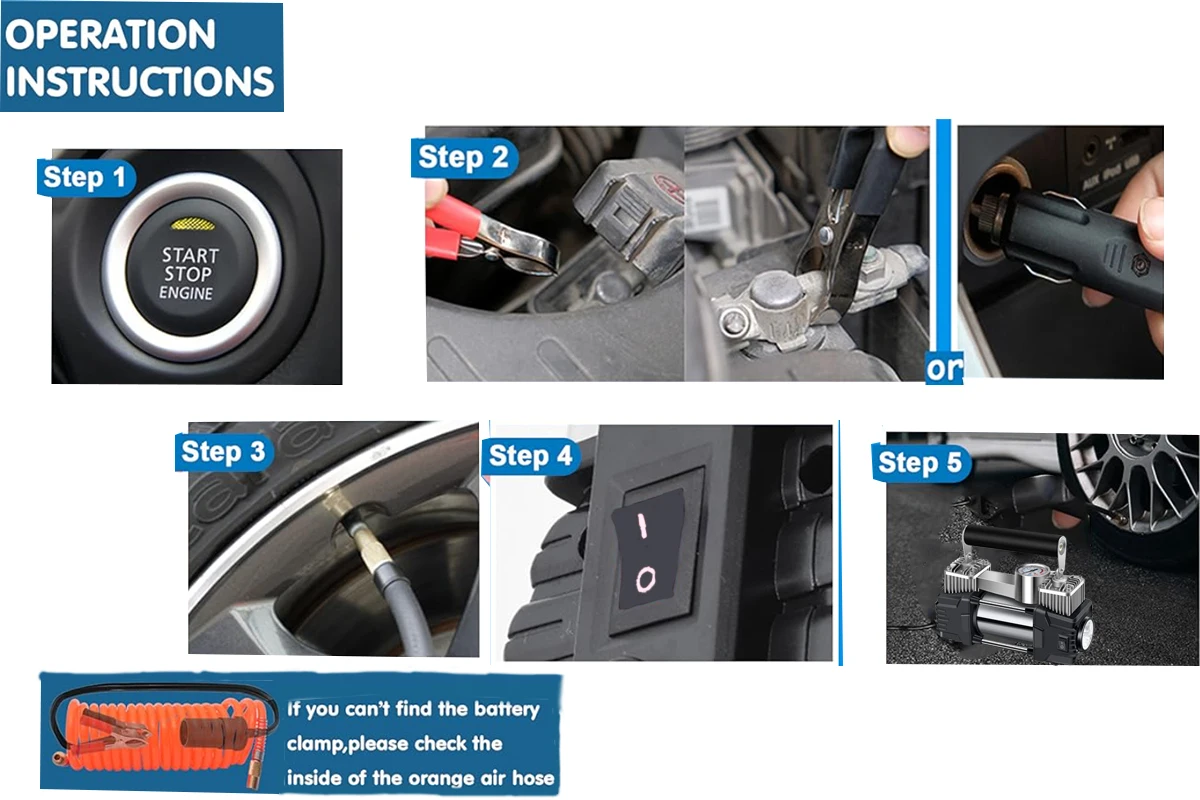 The included accessories—air hose, battery clamps, multiple nozzle adapters, and instruction manual—make this a versatile all-in-one tool for your car, garage, or travel kit.