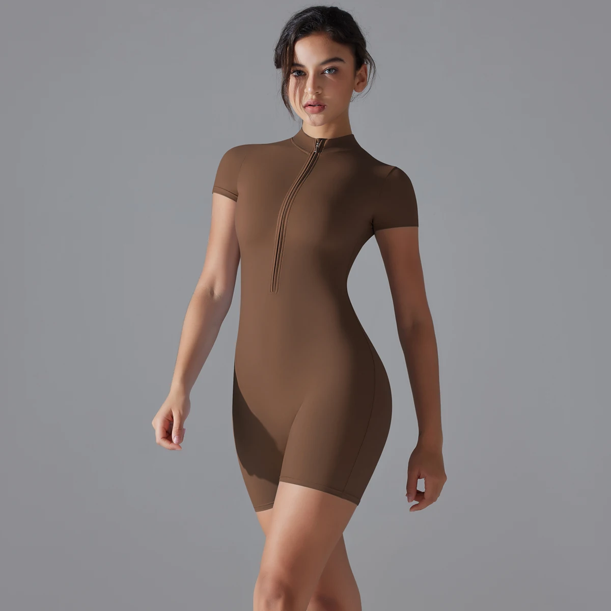 Step into your next workout with confidence in this high-stretch one-piece yoga jumpsuit designed to sculpt, support, and move with you. Made from breathable nylon and spandex, this women’s gym bodysuit features a flattering slim-fit silhouette, short sleeves, and a secure front zipper for easy wear.