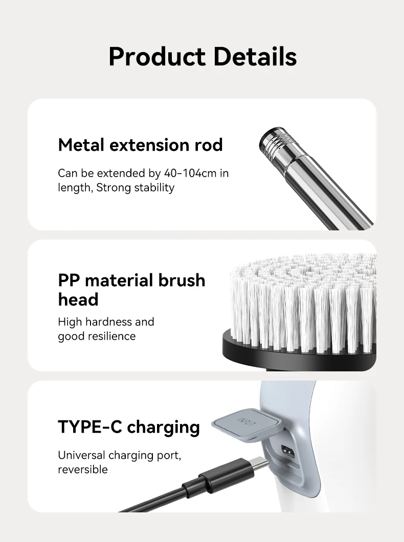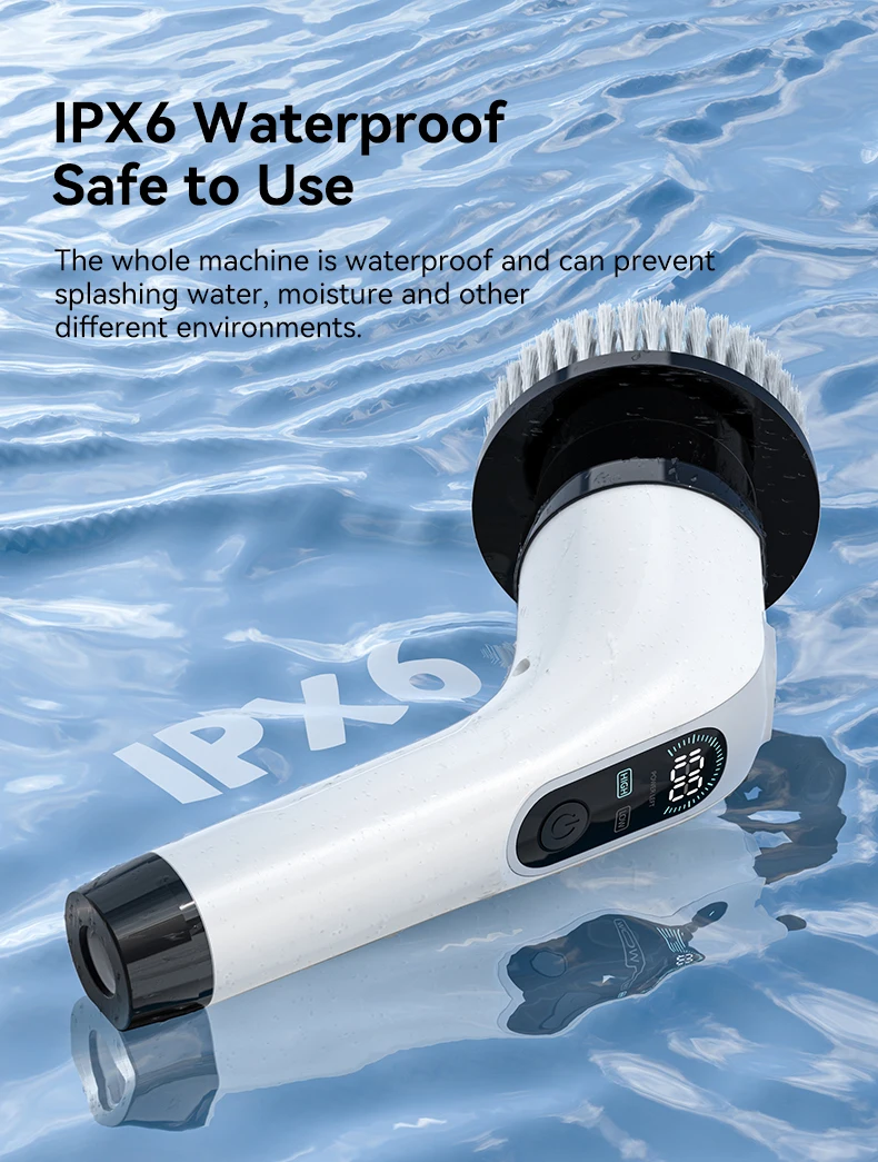 Built with durable ABS and stainless steel materials, this rechargeable handheld scrubber features a waterproof IP67 rating, making it perfect for wet environments. The USB Type-C charging port ensures fast, convenient charging, offering up to 100 minutes of continuous use on low speed. Smart safety protection prevents motor overload by stopping the brush when resistance is too high, keeping the device safe and long-lasting.