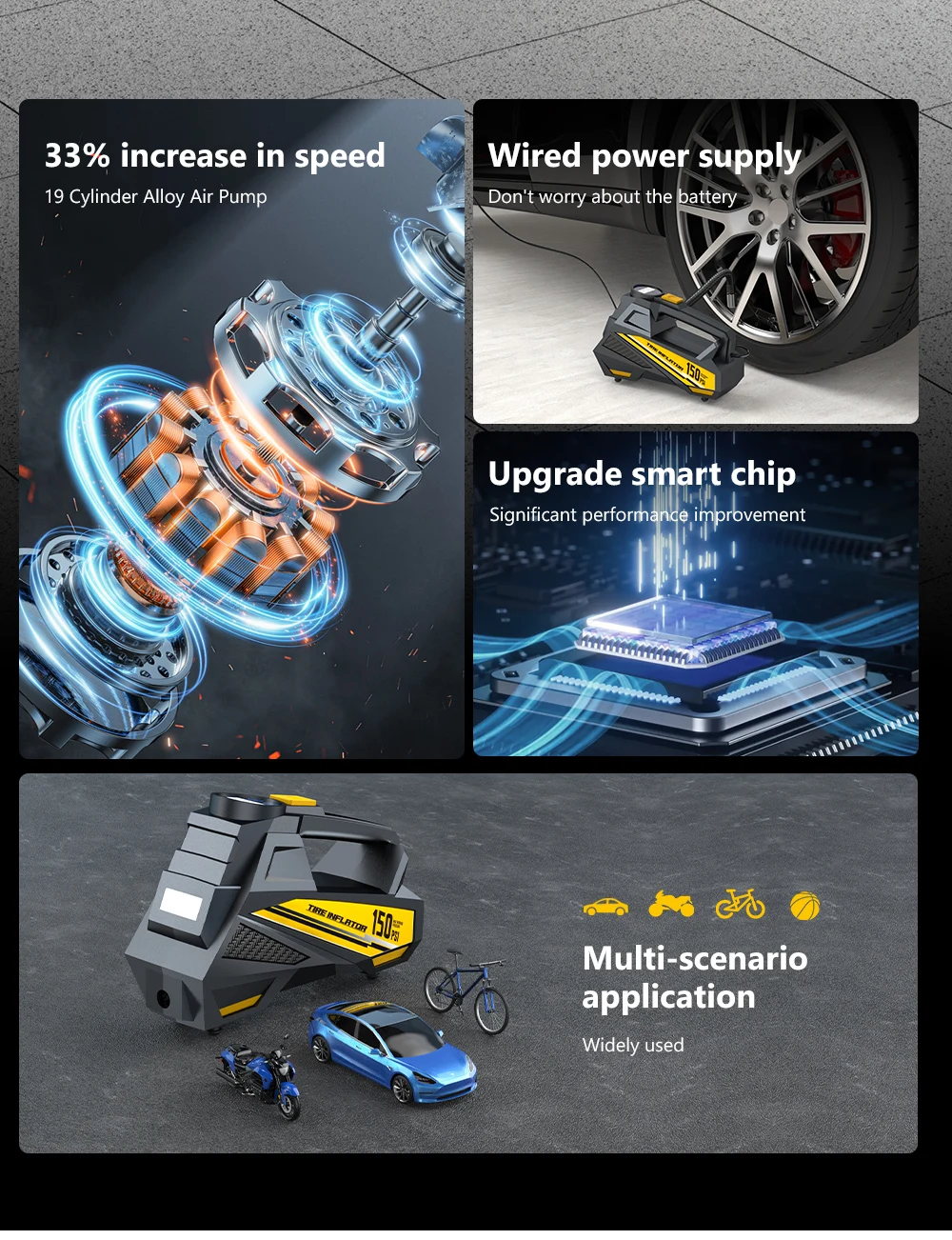 The upgraded motor delivers strong airflow for quicker inflation, while the integrated LED light allows clear visibility during nighttime use or roadside emergencies. Beyond car tires, this versatile pump is also ideal for motorcycles, bicycles, sports balls, and other inflatables, making it a practical tool for everyday use.