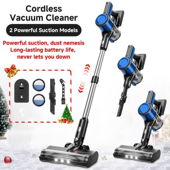 Cordless Vacuum Cleaner with 45–70Kpa powerful suction, 45-minute runtime, anti-tangle brush, and large 50.72oz dust cup. Rechargeable stick vacuum perfect for hardwood floors, carpets, and pet hair.