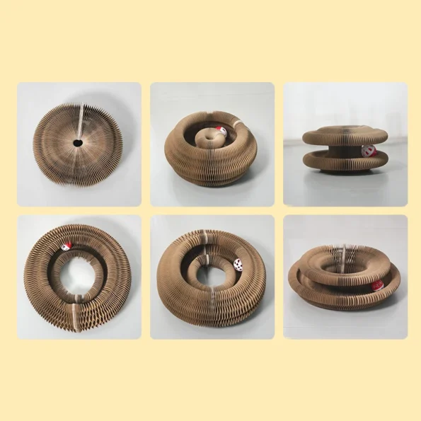 This all-in-one cat toy combines a durable corrugated scratching board, a built-in rolling ball track, and a bell for sound stimulation, encouraging natural scratching, chasing, and exercise behaviors. The honeycomb grid design allows flexible play setups by placing the bell inside or outside the track for added variety.