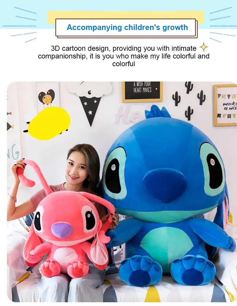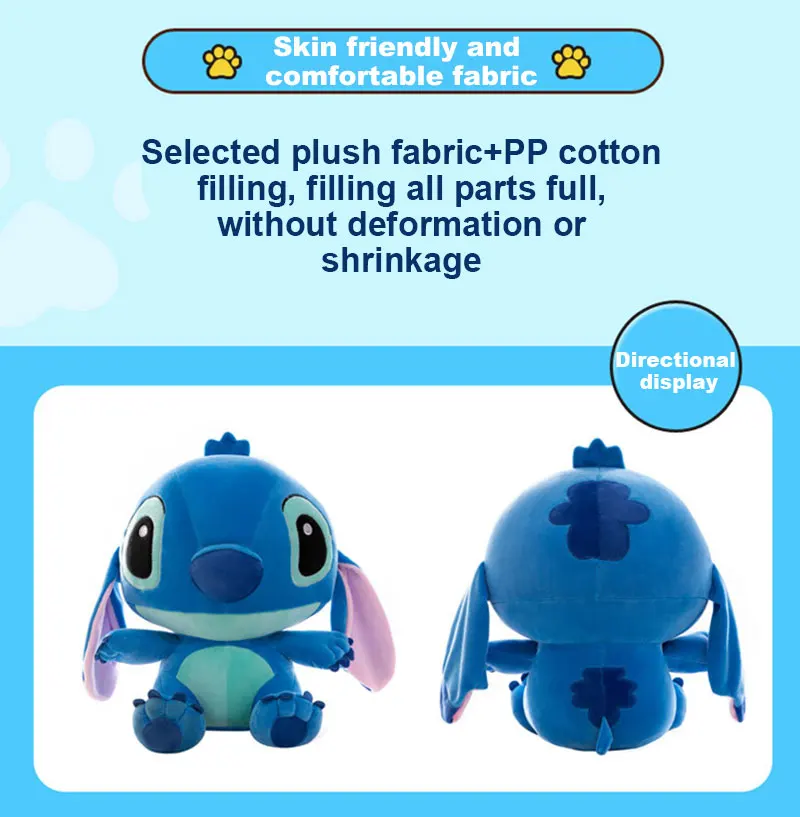 Bring home the magic of Disney with these adorable Lilo & Stitch plush dolls. Made with premium soft plush fabric and filled with eco-friendly PP cotton, they are super cuddly, smooth to touch, and safe for kids. Available in blue and pink, these giant Stitch stuffed toys come in 35cm, 45cm, and 55cm sizes, making them perfect as a plush pillow, cuddle buddy, or room décor. A wonderful choice for birthdays, Christmas, Valentine’s Day, or any special occasion gift.